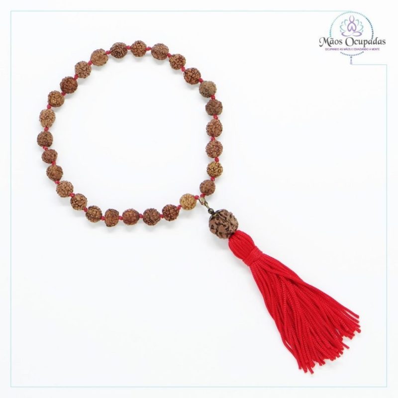 Este japamala de 27 contas em sementes de rudraksha de 8mm possui entremeios em nós. No meru, uma grande semente de rudraksha de 12 mm e tecido.